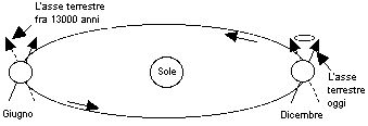 La Terra è inclinata rispetto al piano della propria eclittica di circa 23,5°, il chè fa sì che la sua esposizione ai raggi solari muti in continuazione durante l'arco dell'anno, con la conseguenza di una variazione continua della temperatura, responsabile del mutare delle stagioni. Tuttavia l'asse terrestre, come si può vedere dal disegno qui sotto, non rimane fisso, ma ruota lentissimamente su se stesso in senso opposto alla rotazione della Terra stessa, impiegando un periodo di tempo di 25.800 anni che per comodità diremo 26.000. Questo lento movimento che viene chiamato precessione degli equinozii fa sì che le costellazioni zodiacali, cioè quelle che giacciono sul piano dell'eclittica, vengano traguardate da un osservatore terrestre in maniera che con il passare del tempo esse arretrano al nostro sguardo.